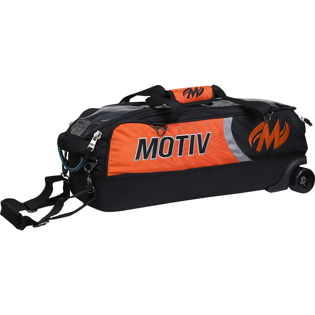 The Apex™ by MOTIV® is a premium 3-ball bag for tournament bowlers. Its large urethane wheels glide smoothly and quietly over hard floors, giving you deluxe mobility. When you need to fly, conveniently detach the pull-strap and tuck it away neatly in the side zipper pocket. For your comfort, it also features luxuriously padded handles. Optional matching shoe bag sold separately.